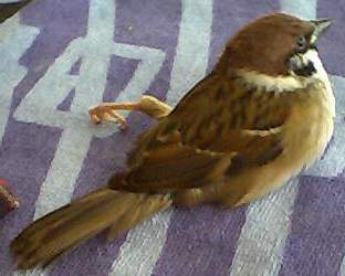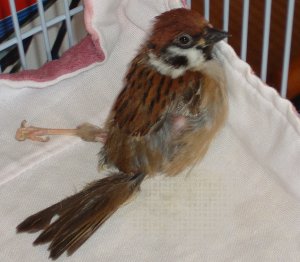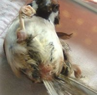 足が前後を向いてしまっているのが解るでしょうか?生まれつきの奇形に加えて 巣から落ちた時のダメージか、拾った時は骨折していました。そのせいで余計悪くなってしまった のかも知れません。左足は後に向かって伸びているので地面につくことができません。歩く時は右足ケンケンです。右足も足の裏をつけることが 出来ないので片足で立つ事もできません。もちろんとまり木にもとまれません。